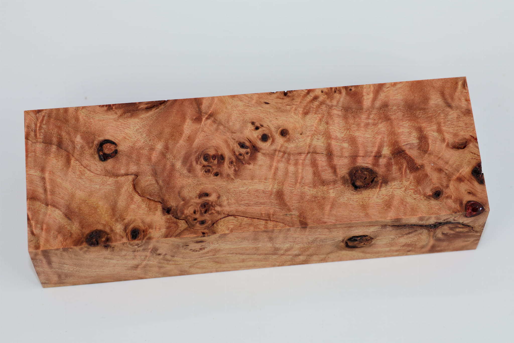 Drewno na całym jego przekroju ma kolor jasnoczerwony, który został uzyskany podczas procesu stabilizacji żywicą z dodatkiem dedykowanego barwnika.